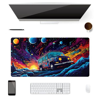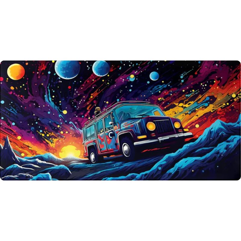 Ce tapis au look rétro-galactique dynamise ton setup avec ses couleurs vives et son van spatial. L’ambiance parfaite pour t'évader en bossant.